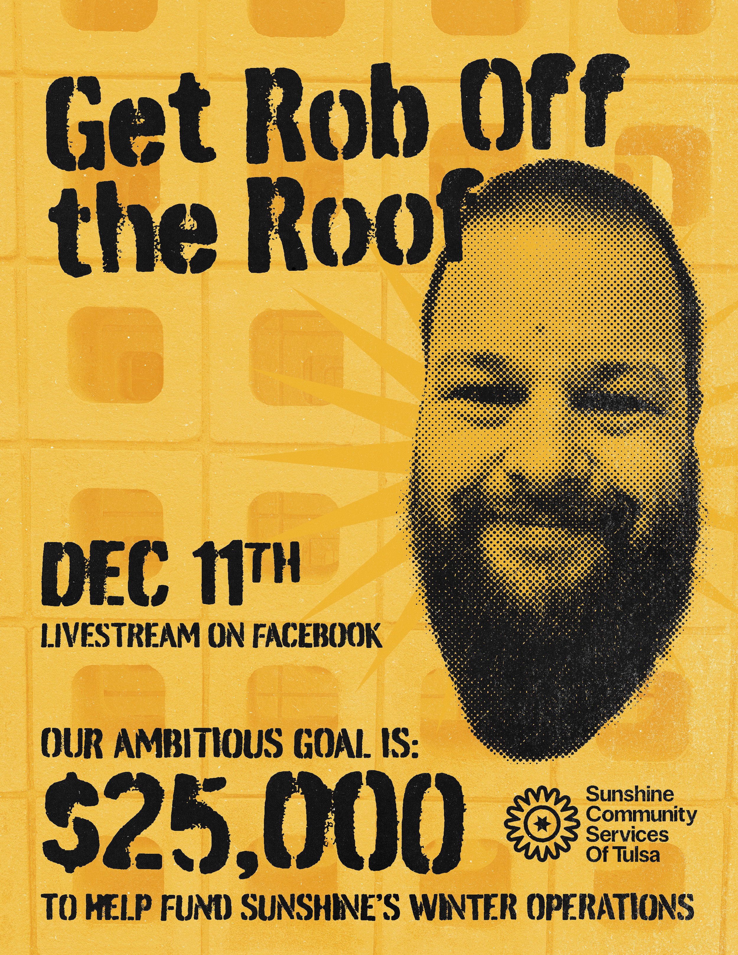 At 5:00 PM on Thursday, December 11th, Rob will climb onto the roof of the Sunshine office and remain there through Sunday at dusk as part of a winter awareness and fundraising event called Get Rob Off the Roof.
